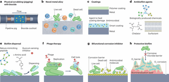 黏附在材料表面的微生物被膜是导致微生物腐蚀的主要原因,传统微生物腐蚀防护手段主要采用物理方法以及化学杀菌剂方法去除生物被膜。该文在传统方法基础上讨论了新兴的微生物腐蚀防治手段,例如抗菌金属材料、新型防腐涂层、杀菌剂增效剂(D-氨基酸类杀菌剂增效剂)、多功能防腐杀菌缓蚀剂、活体生物被膜防腐蚀材料等。