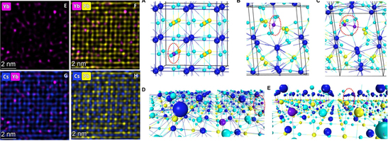 如何从材料学的角度跨界解决光学领域的难题越来越吸引了各国学者的极大兴趣。但因钙钛矿极不耐辐照而导致其在透射电子显微镜下极易分解成卤化盐,这对实验量化证明稀土的作用提出了巨大挑战。该研究首次使用透射电子显微镜直接在原子尺度识别了CsPbCl3钙钛矿中的掺杂Yb3+,证实了Yb3+同时取代Pb2+并占据晶格间隙位置。此外,课题组还通过原子探针断层扫描术直接观察到近原子尺度的CsPbCl3单晶的团簇现象。利用DFT模型进一步证实并解释了实验机理。该研究结果提供了对卤化铅钙钛矿中镧系离子掺杂机制的原子水平理解,并将引领掺杂对钙钛矿性能影响的新思路。
