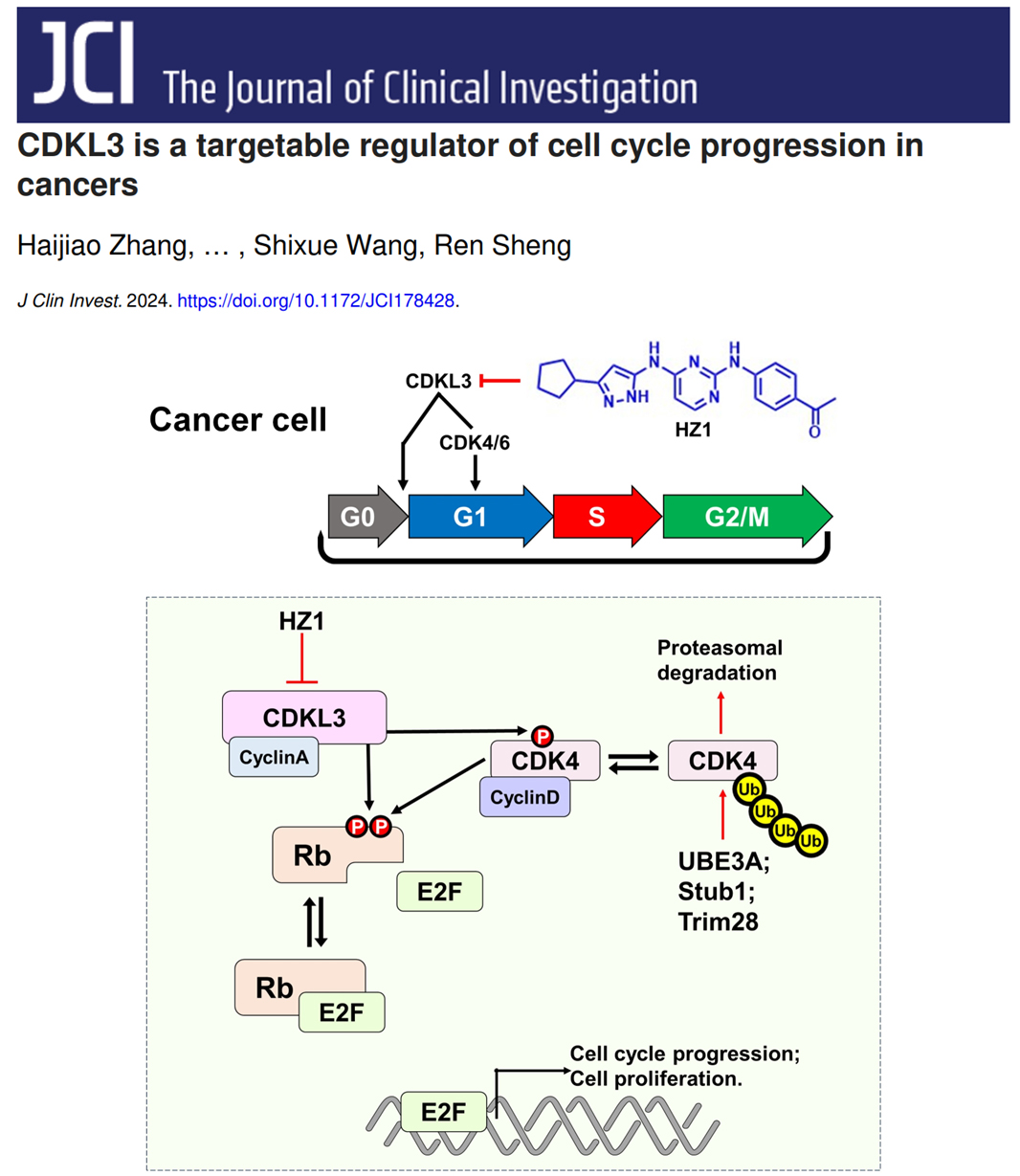 7月4日,太阳成集团tyc33455生命科学与健康学院盛韧教授课题组的研究成果“CDKL3 is a targetable regulator of cell cycle progression in cancers”在线发表于国际顶尖生物医学期刊《The Journal of Clinical Investigation》上(简称JCI)。太阳成集团tyc334552019级博士研究生张海蛟为本文的第一作者,2020级博士研究生林佳慧为共同一作,太阳成集团tyc33455为第一完成单位,盛韧教授为通讯作者。生命学院丁辰教授、费腾教授和刘丽君教授等专家也参与了此项工作。