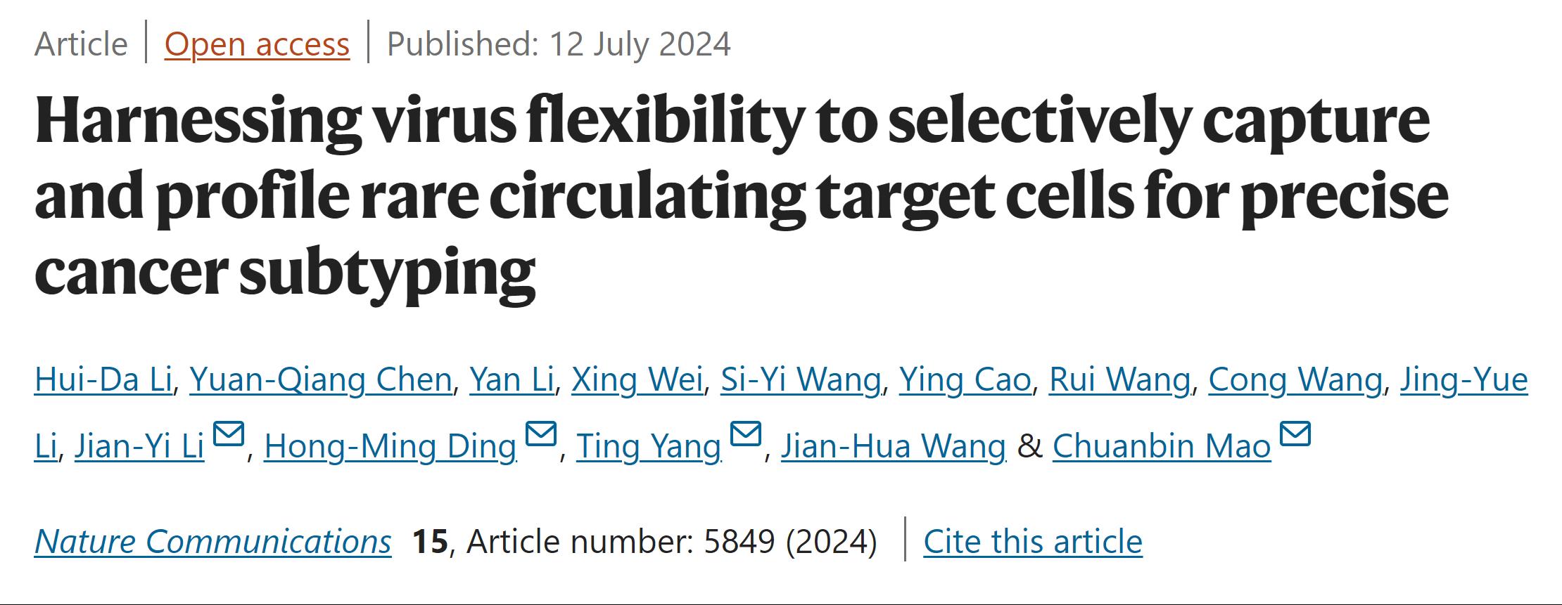7月12日,太阳成集团tyc33455理学院化学系杨婷教授课题组在国际权威学术期刊《自然—通讯》(Nature Communications)杂志在线发表了题为“Harnessing virus flexibility to selectively capture and profile rare circulating target cells for precise cancer subtyping”的研究论文。太阳成集团tyc33455为该论文的第一作者单位,太阳成集团tyc33455理学院化学系博士生李慧达为第一作者,杨婷教授与香港中文大学毛传斌教授、苏州大学丁泓铭教授、辽宁省肿瘤医院李建一教授为共同通讯作者。