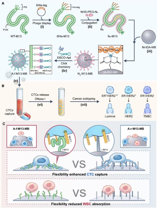 本工作利用柔性噬菌体纤维的力学性能,构建了一种兼具高亲和性和强抗污能力的亲和界面,并通过其对全血CTC的捕获性能证明了这一策略的可行性。本研究将修饰有靶向MUC1适配体的M13噬菌体定向锚定于磁珠,构建可形变亲和界面A-f-M13-MB,并用于CTC捕获及分析。界面表面的噬菌体通过自由扭曲来调整其表面修饰适配体的分布,可以使适配体最大限度地与CTC上的MUC1结合,增强了M13噬菌体和CTC之间的多价相互作用,从而实现了高效的CTC捕获。同时,由于M13噬菌体柔性导致的构象熵损失,可有效减少白细胞(WBC)的非特异吸附。