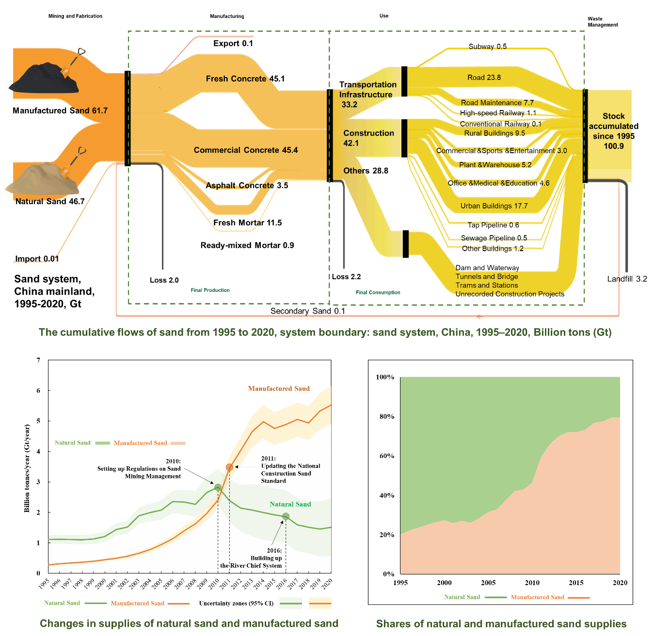 针对上述挑战,该研究团队率先构建了砂子全过程资源流动的监测框架,通过集成多源数据,完成了1995-2020年中国砂子资源流动的精细化追踪。研究发现,为应对天然砂供应短缺及其带来的严重生态环境问题,中国通过供给侧的“天然砂开采管控”及消费侧的“机制砂应用推广”,彻底逆转了中国砂子的供应结构,其中天然砂消费自2010年达峰之后快速下降,同时机制砂占比由20%快速上升至80%左右,从而实现了由天然砂向机制砂的战略转型。这项研究将为世界各国,尤其是发展中国家应对“天然砂短缺危机”提供重要参考和借鉴。该研究工作得到了国家自然科学基金和中国科学院先导项目等的支持。