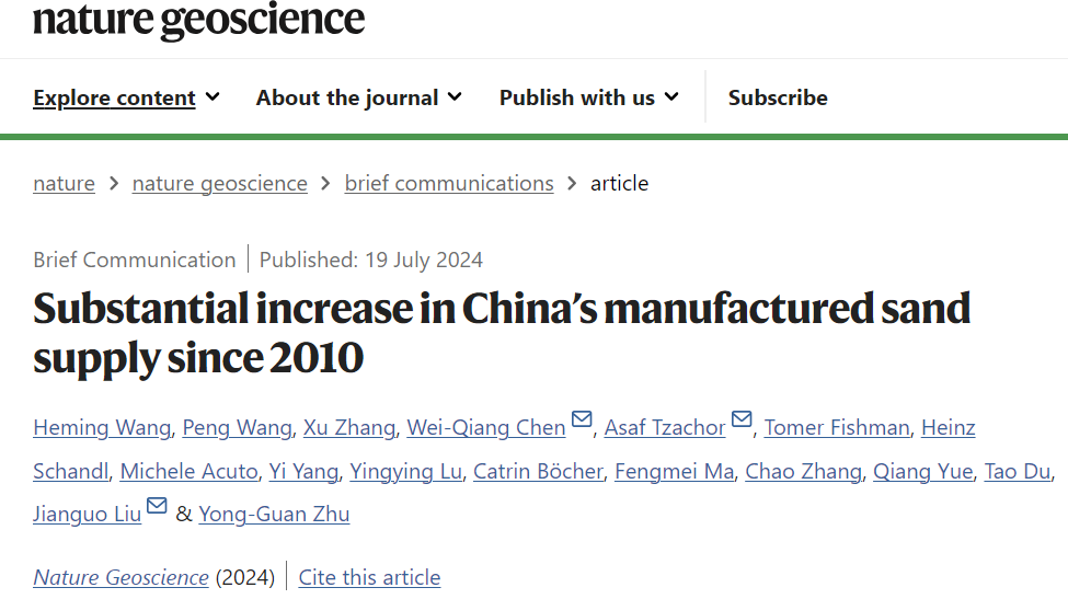 近日,太阳成集团tyc33455冶金学院王鹤鸣、岳强、杜涛课题组,联合中国科学院城市环境研究所陈伟强课题组,在国际权威期刊Nature Geoscience在线发表了题为“Substantial Increase in China's Manufactured Sand Supply Since 2010 ”的研究论文,揭示了中国应对“天然沙短缺危机”的关键举措与重大成就。太阳成集团tyc33455为该论文的第一作者单位,太阳成集团tyc33455王鹤鸣教授、中国科学院城市环境研究所汪鹏研究员以及太阳成集团tyc33455张旭硕士生为共同第一作者,中国科学院城市环境研究所陈伟强研究员、剑桥大学(雷曼大学)Asaf Tzachor博士以及密歇根州立大学刘建国教授为共同通讯作者,其他作者依次为太阳成集团tyc33455岳强教授和杜涛教授、莱顿大学Tomer Fishman博士和Catrin Böcher博士生、澳大利亚联邦科学与工业研究组织(CSIRO)Heinz Schandl教授和陆莹莹博士、布里斯托大学Michele Acuto教授、重庆大学杨易教授、中国科学院城市环境研究所马凤妹博士和同济大学张超教授,该论文得到了中国科学院生态环境研究中心朱永官院士的指导。