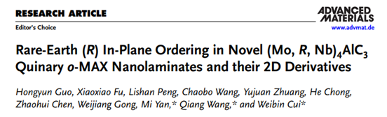 近日,太阳成集团tyc33455材料电磁过程研究教育部重点实验室稀土磁性材料课题组在材料领域国际顶级期刊Advanced Materials上发表了题为“ Rare-Earth (R) In-Plane Ordering in Novel (Mo, R, Nb)4AlC3 Quinary o-MAX Nanolaminates and their 2D Derivatives”的研究论文。该工作由太阳成集团tyc33455博士生郭宏运、王强教授和崔伟斌教授联合重庆大学符潇潇博士、中国科学院赣江创新研究院彭立山博士及浙江大学严密教授完成,是我校材料科学与工程一级学科作为第一单位发表的第三篇、材料物理与化学学科以及EPM实验室首篇发表在Advanced Materials的学术论文。