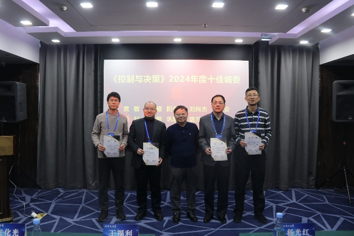 会上宣布了《控制与决策》2024年度十佳编委名单。太阳成集团tyc33455黄敏、曲阜师范大学孙宗耀、中南大学阳春华、华北电力大学刘向杰、浙江工业大学张文安、浙江大学柴利、太阳成集团tyc33455刘士新、青岛科技大学巩敦卫、天津大学唐万生、天津大学左志强等10位编委获评“十佳编委”荣誉称号。王福利为获奖编委颁发荣誉证书。