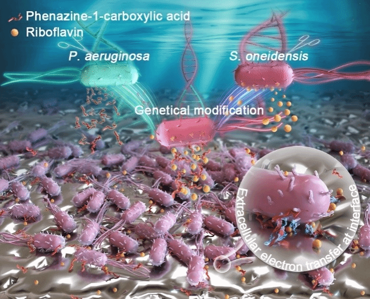 微生物腐蚀是金属材料失效的主要原因之一,全球约20%的腐蚀损失与其直接相关。不锈钢表面致密的钝化膜是其抗腐蚀的关键屏障,然而电活性微生物可通过复杂的生物-非生物界面作用破坏这一保护层,具体机制长期未被阐明。徐大可教授团队以典型电活性微生物—奥奈达希瓦氏菌(Shewanella oneidensis MR-1)为研究对象,通过合成生物学手段对其基因进行编辑,成功构建了可过量分泌电子载体吩嗪-1-羧酸(PCA)的工程菌株(S. oneidensis PCA)。结合高分辨钝化膜表征与分子生物学技术,系统揭示微生物通过“直接-间接电子传递协同”加速钝化膜溶解的全新机制。