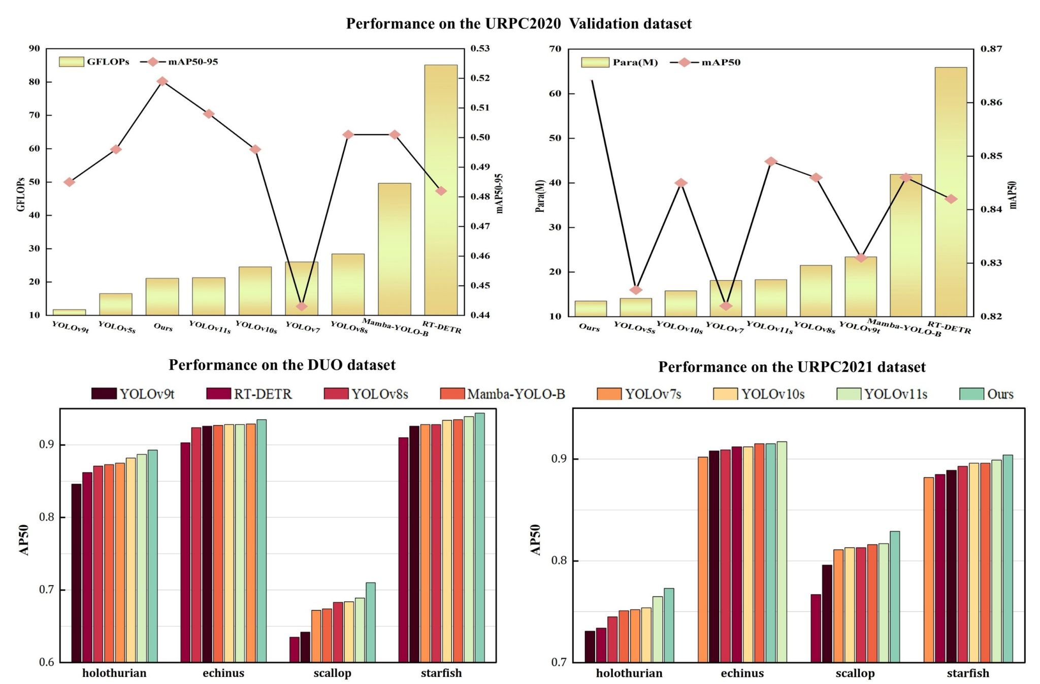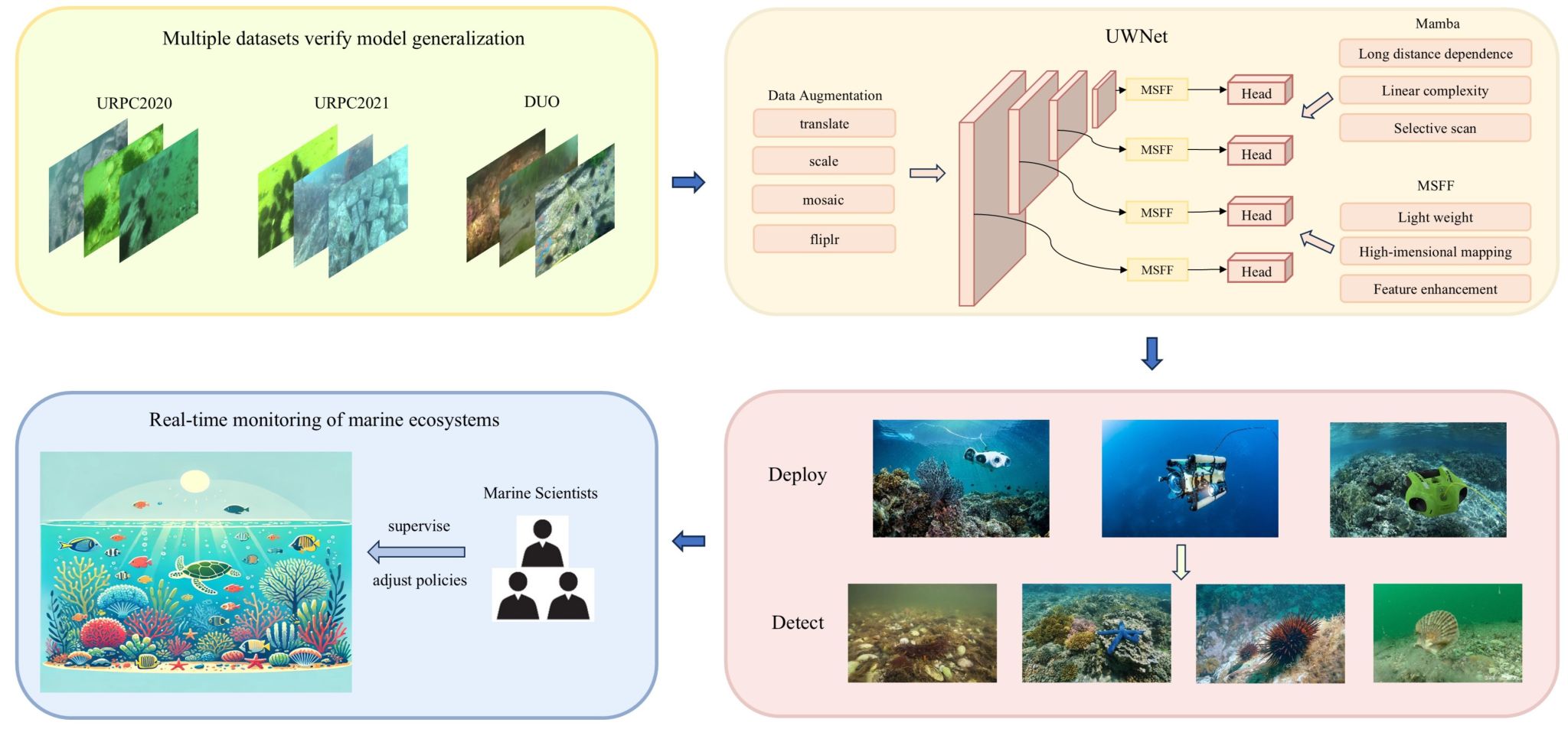 该成果创新性地融合前沿的Mamba模型与卷积神经网络(CNN),提出了一种专用于水下目标检测的轻量化混合架构。通过结构化状态空间模型(SSM)与CNN的协同设计,成功攻克了传统算法在全局建模能力不足和计算复杂度高两大难题,并同步实现了检测精度与硬件计算负担的双重优化。实验结果表明,该框架在多个公开数据集上表现优异,不仅显著提升了检测精度,还大幅优化了计算效率。这一创新性解决方案为海洋资源开发与生态监测提供了兼具高效性和实用性的技术支撑,并在工程应用中展现出巨大的潜力和广阔的应用前景。