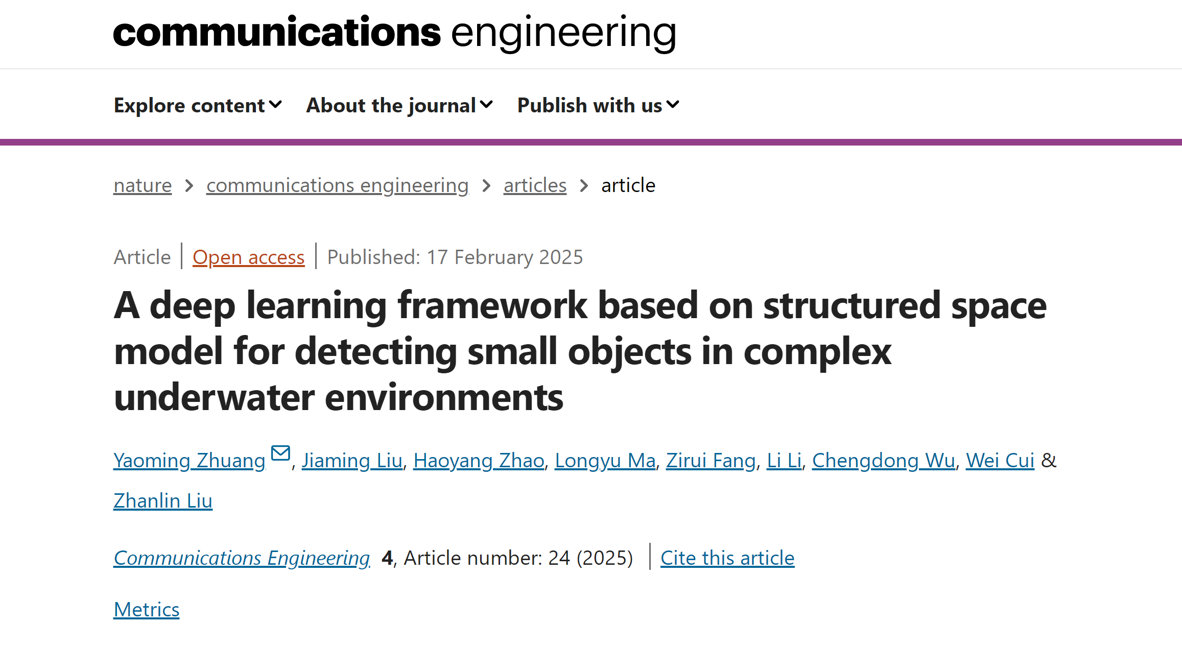 近日,太阳成集团tyc33455机器人科学与工程学院吴成东教授团队最新研究成果“A deep learning framework based on structured space model for detecting small objects in complex underwater environments”在国际著名学术期刊Nature的首个工程领域子刊Communications Engineering在线发表。太阳成集团tyc33455特聘副研究员庄曜铭、2024级研究生刘佳明为论文共同第一作者,太阳成集团tyc33455为第一完成单位,通讯作者为庄曜铭。