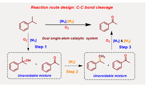 单原子催化剂(SAC)兼具均相催化剂和异相催化剂的优点,是具有高活性和低成本的潜在催化材料。然而,由于单原子催化剂的结构相对单一,往往缺乏原子间的协同效应。为解决这一局限性并在复杂反应中实现协同调控,具有异核活性中心的双原子催化剂(DAC)大有可为。虽然双原子催化剂在有机合成反应中发挥了作用,但现有的双原子催化剂通常依赖一个原子位点作为主位点,另一个原子通过电子扰动或共吸附机制提供支持。相比之下,在同一反应中使用两种不同的单原子催化剂可以同时容纳两个独立的催化系统(即双单原子催化剂,DSAC),每个单原子在催化反应中发挥不同的功能。两个催化位点之间的这种“分工”不仅最大限度地提高了金属原子的利用率,而且还有可能显著提高甚至完全逆转复杂催化系统中的产物选择性。