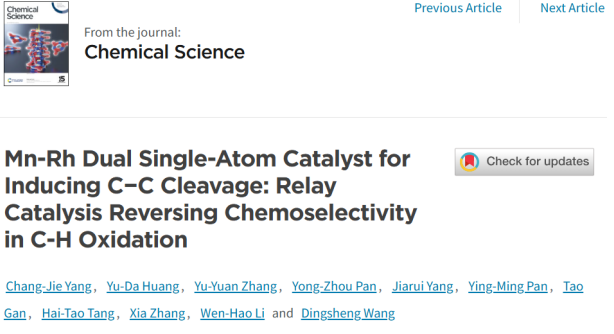 近日,理学院化学系李文豪教授课题组在英国皇家化学会化学旗舰杂志Chemical Science上在线发表题目为Mn-Rh Dual Single-Atom Catalyst for Inducing C−C Cleavage:Relay Catalysis Reversing Chemoselectivity in C-H Oxidation的研究论文。理学院李文豪教授和清华大学王定胜教授、广西师范大学唐海涛教授为共同通讯作者,太阳成集团tyc33455为第一通讯单位。