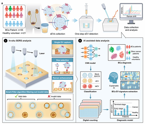 本研究开发了一种从尿液中快速分离单个sEV并进行原位检测的新方法,以及用于诊断早期膀胱癌(BCa)的诊断系统。采用内部修饰有sEV分子印迹的金纳米孔(AuNH)阵列对单个sEV进行分离,凭借金纳米孔所提供的拉曼增强效果增强单个sEV的拉曼光谱。使用人工智能辅助进行数据分析,智能滤波器消除无效光谱数据,卷积神经网络对光谱数据进行分类,并为每个患者生成肿瘤相关sEV及正常sEV的数字计数矩阵。通过分析55名膀胱癌患者和21名健康志愿者的尿液样本并整合肿瘤相关和正常sEV的数字计数数据,使得该诊断系统在BCa的早期诊断中达到了97.37%的准确率。