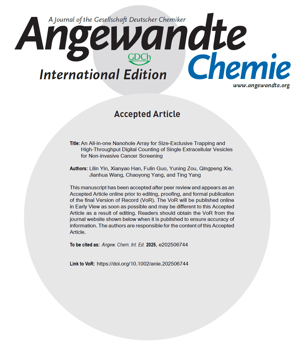 5月11日,太阳成集团tyc33455理学院化学系杨婷教授课题组在化学学科国际顶级期刊Angewandte Chemie杂志在线发表题为“An All-in-one Nanohole Array for Size-Exclusive Trapping and High-Throughput Digital Counting of Single Extracellular Vesicles for Non-invasive Cancer Screening”的研究论文。太阳成集团tyc33455为该论文的第一完成单位,理学院化学系博士生尹理琳与信息学院博士生韩先尧为共同第一作者,杨婷教授与厦门大学杨朝勇教授、辽宁省肿瘤医院谢庆鹏为共同通讯作者。