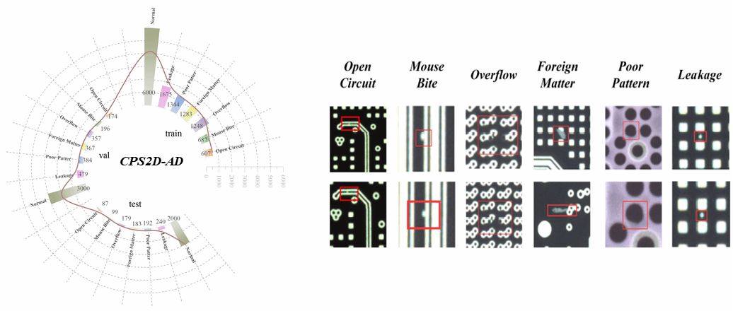 该论文面向集成电路陶瓷封装基板表面缺陷检测领域,构建了大规模二维异常检测数据集CPS2D-AD,像素分辨率高达5um,样本容量超20000张,为目前集成电路领域内全世界规模最大、精度最高的数据集。同时,该论文针对CPS2D-AD数据集构建了无监督、半监督、小样本、全监督等多个任务的Benchmark,为相关领域的研究人员提供了夯实的数据基础。