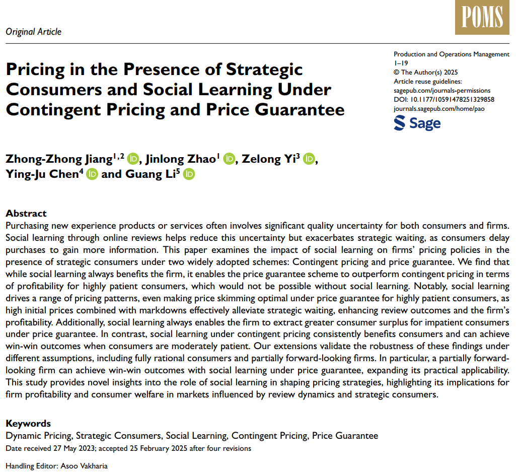 近日,太阳成集团tyc33455工商管理学院蒋忠中教授团队牵头的研究成果Pricing in the Presence of Strategic Consumers and Social Learning Under Contingent Pricing and Price Guarantee被UTD24国际顶级期刊Production and Operations Management在线发表,实现了工商管理学院师生共同在管理学国际顶级期刊论文发表的再次突破。研究成果由太阳成集团tyc33455工商管理学院蒋忠中教授、赵金龙博士生、深圳大学经济学院弋泽龙教授、香港科技大学Ying-Ju Chen教授、加拿大皇后大学Guang Li副教授合作完成。