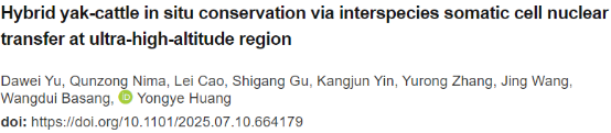 犏牛是牦牛与黄牛杂交后代,兼具牦牛对高原缺氧的适应力和黄牛的高产乳肉性能,是青藏高原的关键畜种,堪称青藏高原的“全能选手”。然而,犏牛雄性不育,自然繁殖难以维持种群优良性状。该研究团队利用种间体细胞核移植技术,实现犏牛原位保种。该项研究体细胞核移植供体细胞获取与胚胎移植均在西藏自治区动物疫病预防控制中心曲水实验基地(海拔高度3650米)进行,是体细胞克隆技术在青藏高原资源原位保种体系中首次成功应用。2025年5月12日成功获得克隆犏牛,是超高海拔环境下的首例克隆牛。当前克隆犏牛状态良好,体重由出生时的25.9千克增长至60日龄的71千克,此项成果实现了优良犏牛的“精准复刻”,可为高海拔地区动物原位保护提供范式,为大规模繁育优质种源提供了可能。近来,该研究团队还参与了野猪种质资源保护以及西藏濒危樟木牛抢救工作,延续了科学研究与实际应用相结合的思路,致力于保护种质资源,推动生态可持续发展。本项研究工作得到学校与生命学院的大力支持。