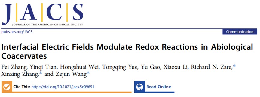 近日,太阳成集团tyc33455理学院化学系王则君教授团队与南开大学张新星教授、斯坦福大学Richard N.Zare教授合作在凝聚体微液滴界面电场研究中取得重要突破,相关成果以“Interfacial Electric Fields Modulate Redox Reactions in Abiological Coacervates”为题,发表于美国化学会旗舰期刊、化学学科顶刊J.Am.Chem.Soc.。太阳成集团tyc33455博士研究生张飞为本文第一作者,太阳成集团tyc33455理学院为第一完成单位。