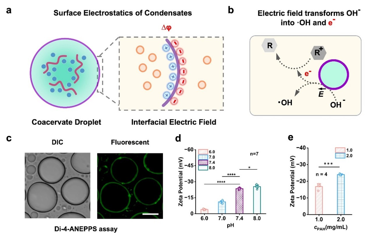 液-液相分离(LLPS)形成的生物分子凝聚体的表面产生可以驱动氧化还原反应的界面电场(IEFs)。团队利用聚(丙烯胺盐酸盐)与腺苷-5'-三磷酸二钠盐(PAH-ATP)聚阳离子电解质-阴离子对构建凝聚体模型。通过电压敏感荧光探针检测发现,PAH-ATP凝聚体微液表界面存在显著界面电场(IEF),该IEF能有效将氢氧根离子(OH⁻)撕裂为电子(e⁻)和羟基自由基(•OH)。这些发现表明,由LLPS凝聚体驱动的电化学功能不仅限于生物学领域,还可应用于可被设计的人工非生物系统。