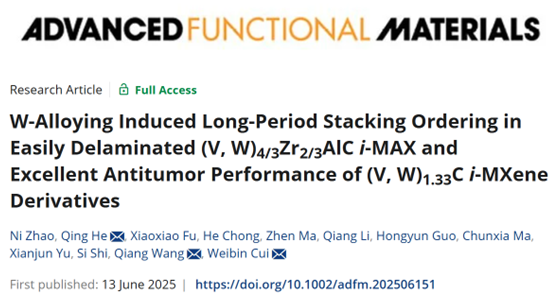 在材料科学与生物医学的交叉领域,二维材料MXene因其独特的层状结构和表面化学性质备受关注。然而,V基i-MAX相材料(如V4/3Zr2/3AlC)因难以剥离成MXene衍生物,其应用潜力受到限制。崔伟斌教授课题组与重庆大学黄晓旭教授团队符潇潇博士、复旦大学医学院何青博士紧密合作,通过巧妙的W合金化策略,首次发现了V基i-MAX材料的长周期堆垛有序(LPSO)结构调控,并成功剥离出具有优异电容性能和显著抗肿瘤效果的(V,W)1.33C i-MXene。