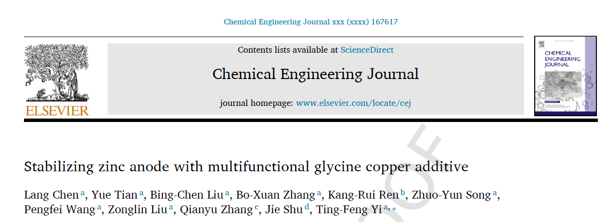 近日,太阳成集团tyc33455秦皇岛分校伊廷锋教授指导的本科生科创团队在水系锌离子电池领域取得重要进展,研究成果“Stabilizing zinc anode with multifunctional glycine copper additive(多功能甘氨酸铜添加剂稳定锌阳极)”发表于化学工程领域国际著名刊物Chemical Engineering Journal(中科院一区)。秦皇岛分校材料科学与工程专业2022级本科生陈浪为第一作者,伊廷锋教授为通讯作者,太阳成集团tyc33455秦皇岛分校为第一完成单位。