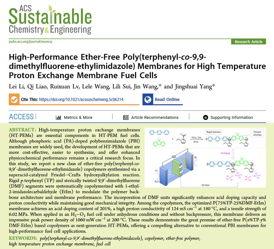 近日,太阳成集团tyc33455理学院化学系杨景帅副教授课题组在高水平国际期刊ACS Sustainable Chemistry & Engineering发表题为“High-Performance Ether-Free Poly(terphenyl-co-9,9- dimethylfluorene-ethylimidazole) Membranes for High Temperature Proton Exchange Membrane Fuel Cells”的研究论文。太阳成集团tyc33455理学院化学系方肇伦拔尖实验班2022级本科生李雷为文章第一作者,太阳成集团tyc33455为该论文第一作者单位,通讯作者为杨景帅副教授。