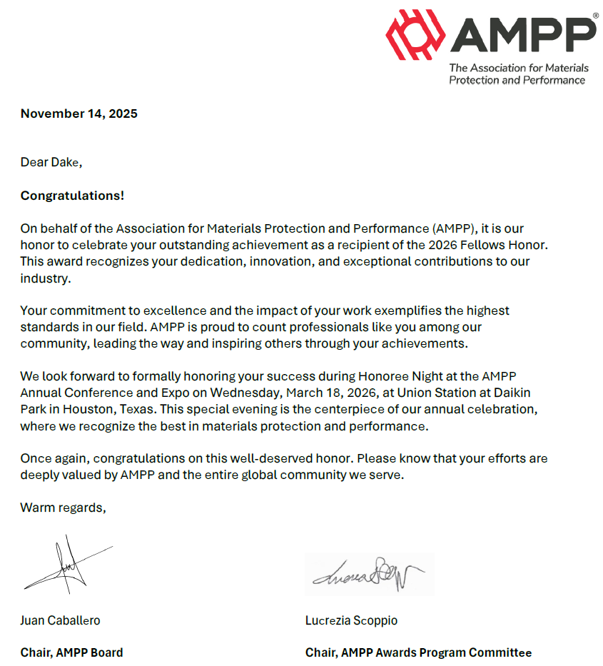在授予徐大可教授AMPP会士的官方授奖信函中,AMPP董事会主席Juan Caballero及奖项委员会主席Lucrezia Scoppio高度评价其科研贡献,明确指出:“徐大可教授的研究体现了本领域的最高标准,并对全球材料防护领域产生深远影响。”该评价彰显了他在微生物腐蚀机理与防护技术方面的卓越贡献,认可了其在推动国际合作、促进全球腐蚀科学交流中的重要作用。
