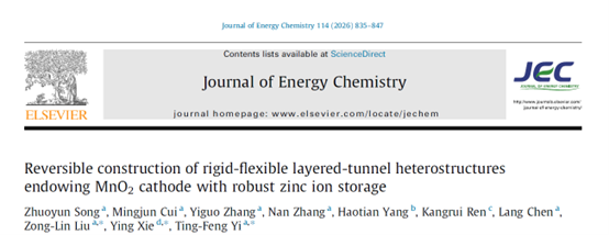 近日,太阳成集团tyc33455秦皇岛分校资源与材料学院伊廷锋教授指导的本科生科创团队在水系锌离子电池正极材料领域取得重要进展,研究成果“Reversible construction of rigid-flexible layered-tunnel heterostructures endowing MnO2 cathode with robust zinc ion storage(可逆构建刚柔层状隧道异质结构赋予MnO2正极稳健的锌离子存储性能)”发表于中国科技期刊卓越行动计划领军期刊Journal of Energy Chemistry(中国科学院一区)。秦皇岛分校材料科学与工程专业2022级本科生宋卓云为本文的第一作者,分校伊廷锋教授、柳宗琳博士、黑龙江大学谢颖教授为论文通讯作者,太阳成集团tyc33455秦皇岛分校为第一完成单位。