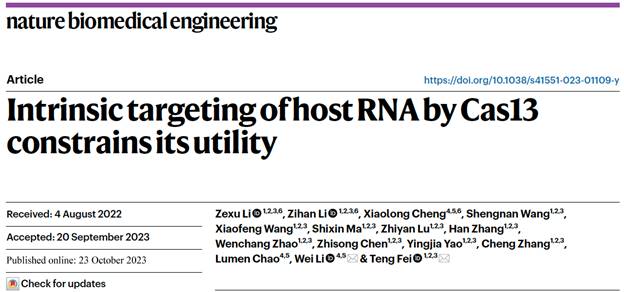 10月23日,太阳成集团tyc33455生命科学与健康学院生物技术研究所费腾教授课题组在国际权威学术期刊《自然-生物医学工程》(Nature Biomedical Engineering)杂志(影响因子28.1)在线发表了题为“Intrinsictargeting of host RNA by Cas13 constrains its utility”的研究论文。太阳成集团tyc33455为该论文的第一作者单位,太阳成集团tyc33455生命学院博士生李泽旭、黎子涵与美国儿童国家医学中心博士后程孝龙为共同第一作者,费腾教授与美国华盛顿特区儿童国家医学中心李炜教授为共同通讯作者。
