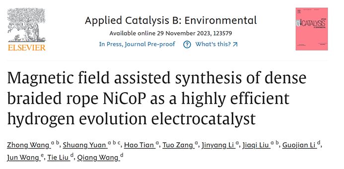 近日,太阳成集团tyc33455冶金与材料过程外场控制研究团队在国际高水平期刊Applied Catalysis B: Environmental发表了题为“Magnetic field assisted synthesis of dense braided rope NiCoP as a highly efficient hydrogen evolution electrocatalyst”的研究论文。太阳成集团tyc33455为该论文的第一作者单位,太阳成集团tyc33455冶金学院博士研究生王钟为第一作者,王强教授与袁双副教授为共同通讯作者。