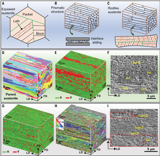 强度和塑性的同时提升是钢铁材料领域长期以来存在的重大理论难题,也是从基础研究到技术创新和应用实践的瓶颈,尤其当强度达到2000 MPa级别时,塑性出现断崖式下降,均匀延伸率普遍低于10%,其根本原因在于传统马氏体的初始高密度位错难以继续增殖,且无序排列的几何取向结构微观塑性变形极不均匀,容易产生局部应力/应变集中。该研究针对2000 MPa级马氏体超高强钢塑性低的问题,创新提出“马氏体拓扑学结构设计+亚稳相调控”协同增塑新机制,成功制备出系列低成本C-Mn系新型超高强钢,打破了超高强钢对复杂制备工艺和昂贵合金成分的依赖,也突破了现有2000 MPa级马氏体高强钢抗拉强度—均匀延伸率的性能边界。研究团队提出简单高效的制备工艺路线,构筑出一种全新的拓扑学双重有序排列的马氏体和多尺度亚稳奥氏体的纳米级多层次组织结构。该组织结构通过在变形过程中诱发板条界面(in-lath-plane slip)位错滑移、界面塑性和相变诱发塑性(TRIP)等多种增强增塑机制,促使材料具有持续较高的加工硬化能力,大幅度提升其强度和塑性,实现了1600~1900 MPa屈服强度,2000~2400 MPa抗拉强度和18%~25%均匀延伸率的极致性能。该研究工作得到了国家自然科学基金、中央高校基本业务费及中国博士后科学基金等项目资助。