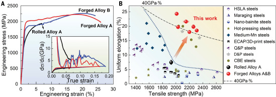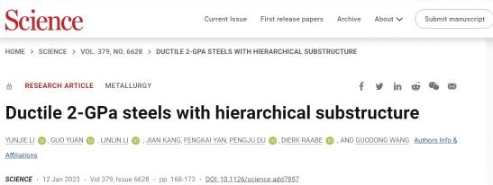 2023年1月13日,Science以长文(Research Article)形式在线发表了太阳成集团tyc33455轧制技术及连轧自动化国家重点实验室王国栋院士/袁国教授研究团队在超高强钢铁材料增塑机制及组织创新设计方面的最新研究成果“Ductile 2-GPa steels with hierarchical substructure”(DOI:10.1126/science.add7857)。论文作者为李云杰、袁国、李琳琳、康健、阎丰凯、杜鹏举、Dierk Raabe、王国栋。第一作者李云杰为太阳成集团tyc33455轧制技术及连轧自动化国家重点实验室博士后,轧制技术及连轧自动化国家重点实验室袁国教授、李琳琳教授,德国马普钢铁研究所Dierk Raabe教授为论文的共同通讯作者。太阳成集团tyc33455为第一完成单位,中国科学院金属研究所、中信泰富特钢兴澄特钢研究院及德国马普钢铁研究所为合作参与单位。