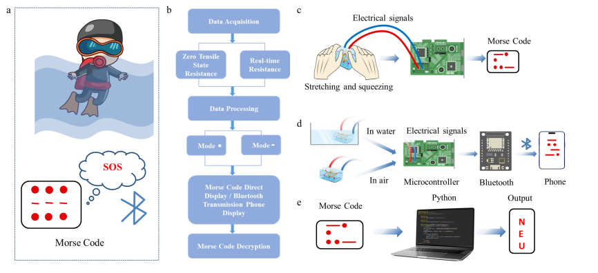 该研究设计并制备了一种基于果胶的多糖导电水凝胶传感器PPTP。PPTP水凝胶传感器具有优异的机械性能、高导电性、高灵敏度以及可回收性,并且此水凝胶仅通过物理交联形成,制备方法简单环保。在应用方面,该水凝胶传感器不仅可以用于监测人体日常生理活动,例如手指、手腕、肘部的活动,还可以结合摩斯密码和无线蓝牙,通过PPTP水凝胶传感器形变产生的电信号对信息进行加密,实现便携式信息传输,最终通过Python程序实现信息解密。PPTP水凝胶在健康监测、信息加密传输、可穿戴电子皮肤、人机交互等领域具有重要意义。