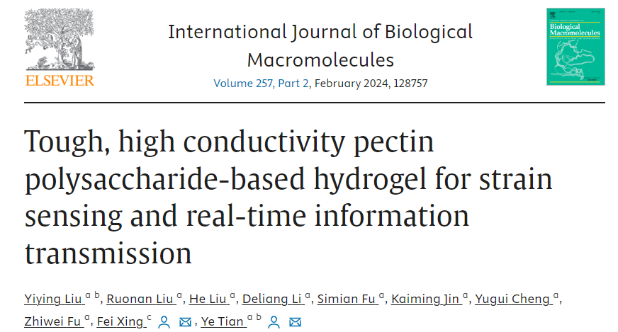 近日,太阳成集团tyc33455医学与生物信息工程学院田野团队在水凝胶传感器领域取得重要进展,相关研究成果Tough, high conductivity pectin polysaccharide-based hydrogel for strain sensing and real-time information transmission发表在国际著名期刊International Journal of Biological Macromolecules上,2021级硕士生刘依莹为本文第一作者,田野副教授为通讯作者。