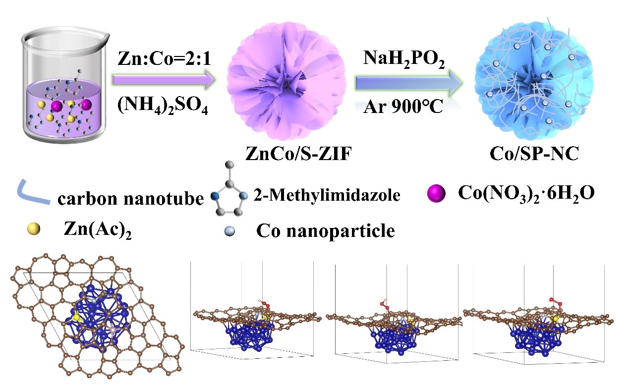基于此,该研究团队制备了具有高度支化碳纳米管的三维氮/磷/硫-三掺杂纳米花双功能催化剂(Co/SP-NC),其主要是以硫酸铵为表面活性剂,以次磷酸钠为还原剂。硫酸铵驱动二维Zn/Co-ZIF自组装为三维纳米花同时提供活性S原子。此外,次亚磷酸钠诱导三维Zn/Co-ZIF纳米花表面形成高支化的碳纳米管。此外,第一性原理计算证实了氮、磷、硫的引入可以有效激活水和氧分子,同时形成大量的缺陷位点并改变Co物种周围的配位环境,大大增加了活性中心的数量。与此同时,结果表明,适当的P掺杂不仅可以提高基底的电子导电性,也有助于提高OER/ORR过程中的电荷转移。所制备的Co/SP-NC电催化剂具有良好的双功能活性,半波电位为0.8603 V,10 mA cm-2下的过电位为343 mV。由Co/SP-NC组装的锌空气电池具有超高的功率密度(187mw cm−2)和良好的循环性能(超过280 h)。这项工作为制备三维自组装的纳米花提供了一种可控的方法尤其适用于可充电锌-空气电池。
