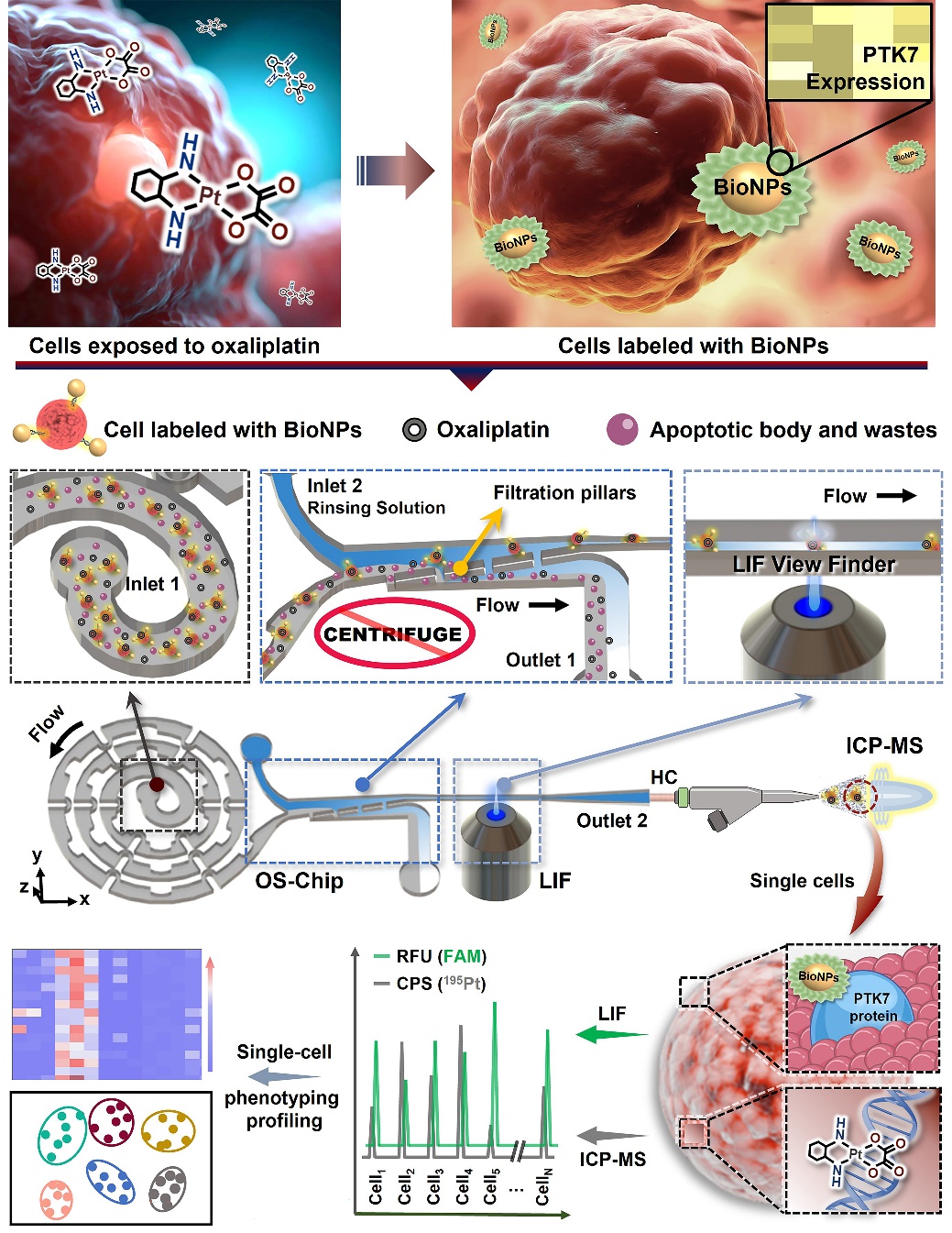 为解决上述问题,该团队研制了一系列模块化的光谱-质谱二维单细胞检测平台。高表面积的适配体标记纳米荧光探针可精准识别表达特异性蛋白的肿瘤细胞,利用自主研制的单细胞聚焦排列——样品纯化——荧光/质谱连续检测微全分析(μTAS)芯片,对复杂生物样品中的目标细胞进行聚焦、排列、纯化,实现激光诱导荧光(LIF)和电感耦合等离子体质谱(ICPMS)二维模式的单细胞高分辨、高灵敏识别与检测。该系统可以在单个细胞水平上评估细胞对铂类药物摄取与诱导PTK7蛋白质表达的关联,进而实现稀有肿瘤细胞的表型区分。