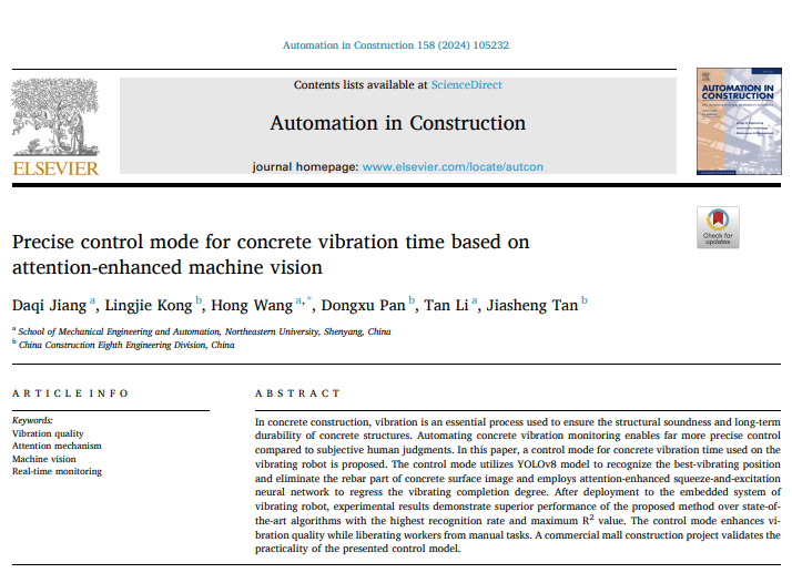 近日,机械工程与自动化学院王宏教授课题组与中国建筑第八工程局有限公司校企合作的研究成果在建筑工程与土木工程信息化领域的国际顶级期刊Automation in Construction(影响因子10.3)上发表。论文题目为Precise control mode for concrete vibration time based on attention-enhanced machine vision,该文第一作者为博士研究生蒋大奇,通讯作者为王宏,论文的第一署名单位为太阳成集团tyc33455机械工程与自动化学院,论文的第二署名单位为中国建筑第八工程局有限公司。