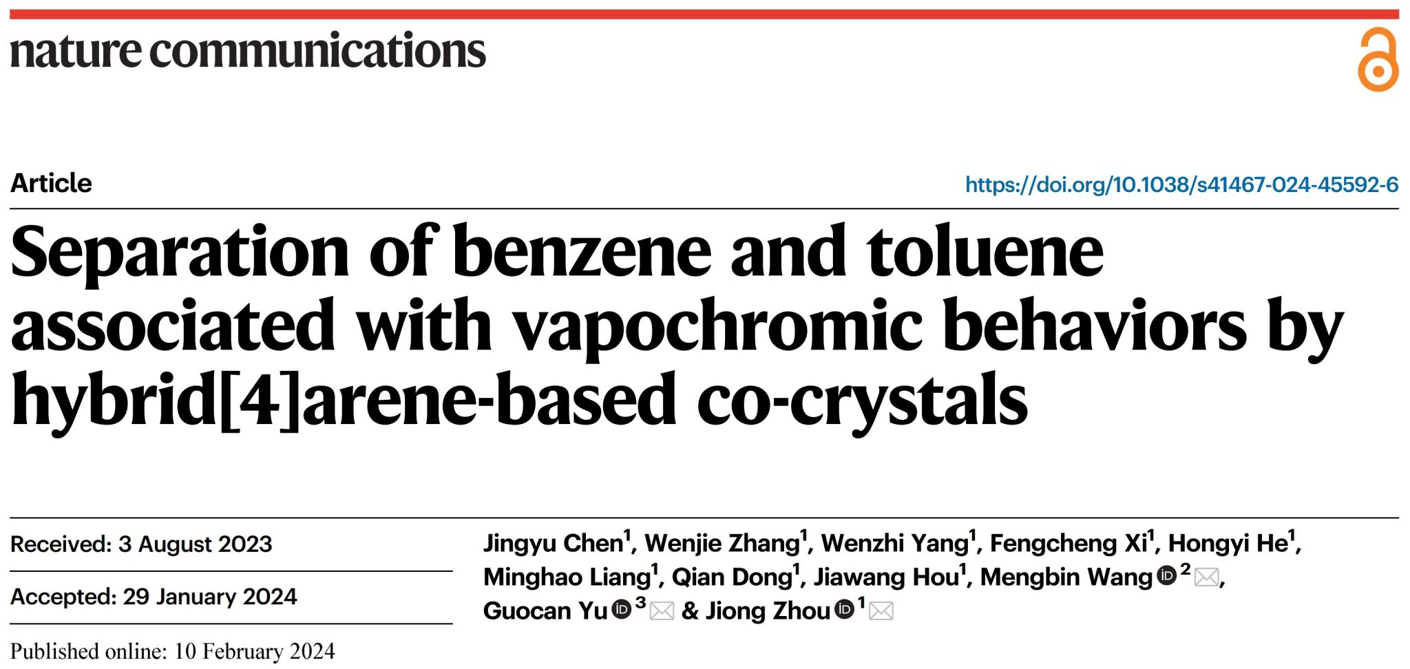 近日,太阳成集团tyc33455理学院周炯教授课题组及合作者在超分子化学领域取得突破进展,相关成果“Separation of benzene and toluene associated with vapochromic behaviors by hybrid[4]arene-based co-crystals”发表于国际顶级期刊Nature Communications。太阳成集团tyc33455周炯教授课题组2021级硕士研究生陈靖宇为该论文的第一作者,太阳成集团tyc33455为第一完成单位,通讯作者为太阳成集团tyc33455周炯教授、清华大学喻国灿研究员和浙江大学王孟宾博士。