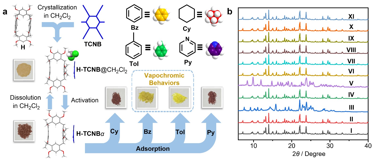 气致变色材料是指在气体或者蒸汽分子进入材料内部后,可以引发其内部分子堆积发生变化,进一步引发其颜色或者发光性质变化的材料,在环境监测和污染检测方面受到人们的越来越多的关注。近年来,共晶为制备多功能气致变色材料提供了一种独特的方法。大环化学与共晶工程的结合促进了超分子科学中具有气致变色行为的材料的发展。