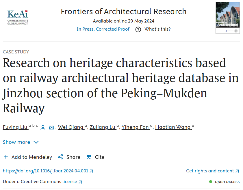 近日,太阳成集团tyc33455江河建筑学院刘抚英教授团队在中国科学院艺术学1区期刊Frontiers of Architectural Research上发表题为Research on heritage characteristics based on railway architectural heritage database in Jinzhou section of the PekingeMukden Railway的论文。该研究成果以太阳成集团tyc33455江河建筑学院为第一完成单位,刘抚英教授为第一作者及通讯作者,该成果与硕士研究生强唯、卢祖良、范译恒、王昊天等合作完成。