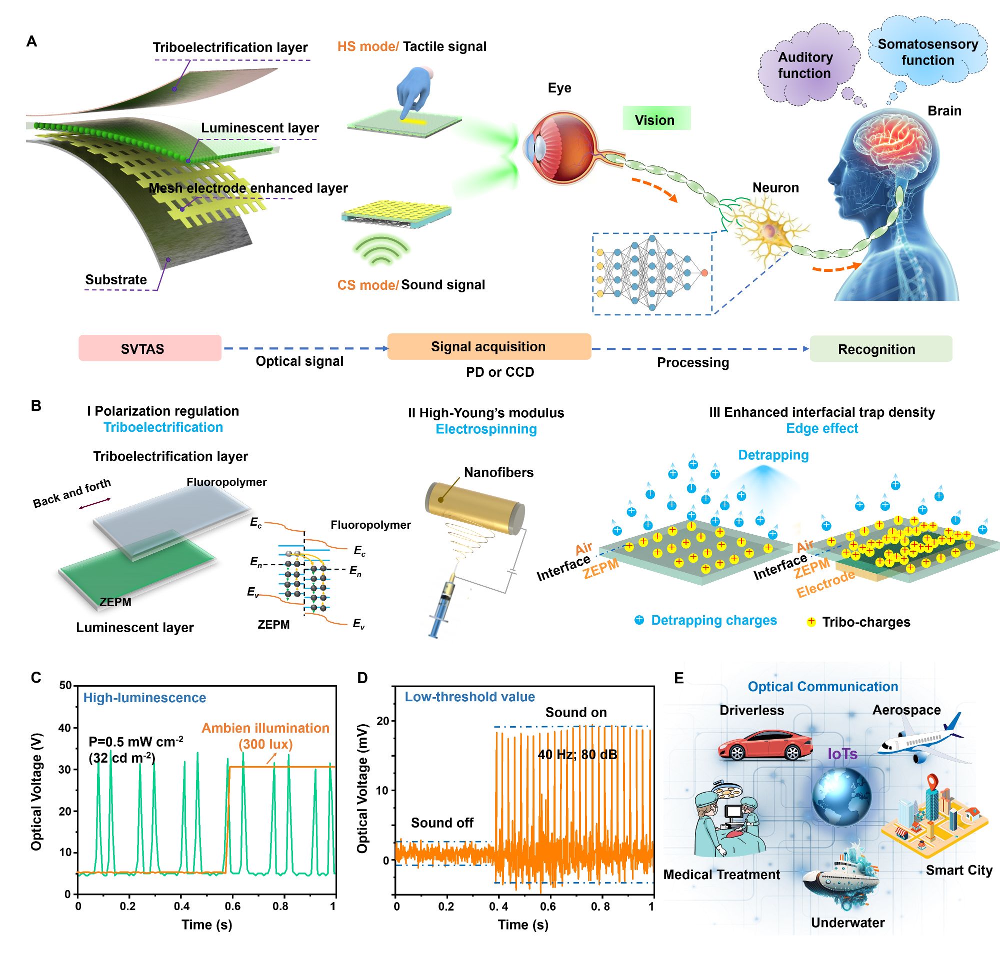基于摩擦起电和电致发光效应的摩擦起电诱导电致发光(TIEL)作为一种新式ML被提出并引起了广泛关注。它可以将温和的机械刺激转化为实时发光,为可视化传感器的开发提供了创新方案。当两种不同的材料彼此动态相互作用时,由它们界面处的摩擦起电效应产生的表面电荷会在电致发光材料中产生快速变化的电场,能够实现具有简化结构、低触发阈值、高响应性、优异的可重复性和稳定性等特性的高效电致发光。特别是TIEL具有广泛的材料选择和更灵活的结构设计,有利于优化复合材料的组件和架构,拥有在各种环境中超灵敏的机械传感潜力,特别是人工可视化智能感知系统。因此,本工作提出了一种基于摩擦诱导电致发光(TIEL)单元的新型自供能可视化触觉-声学传感器(SVTAS)。在水平滑动(HS)模式下它具有0.5 mW cm-2(32 cd m-2)的高亮度和0.5 kPa的低检测限值。同时,SVTAS能够在接触分离(CS)模式下将声波刺激转换为TIEL信号,对44.07 Hz的声音表现出最高的响应,信噪比(SNR)高达8.7 dB-1,并具有0.8 ms的超快响应时间。此外,基于SVTAS构建的先进人工可视化智能感知系统,在识别运动轨迹和不同单词/句子的人类语音方面具有出色的性能。这项研究为新一代自供电可视化智能感知系统的高效和可持续发展创造了新的可能性,同时为无电磁干扰的无线通信提供了新型解决方案。
