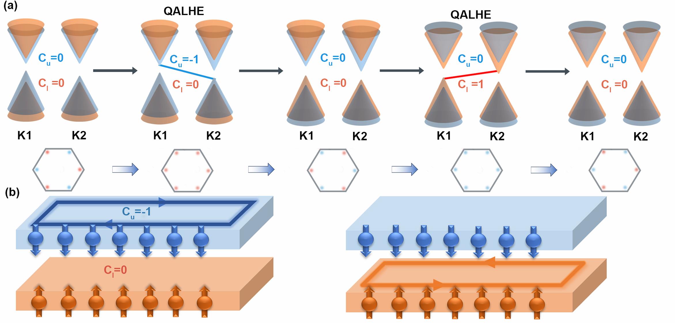 图注(a) 双轴应变下范德瓦尔斯异质双层体系的能带和Berry曲率示意图;(b) 双轴应变诱导的QALHE示意图