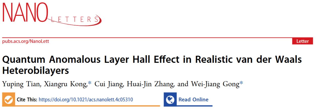 近日,理学院物理系量子材料研究组在层霍尔效应领域取得重要进展。研究成果以“Quantum Anomalous Layer Hall Effect in Realistic van der Waals Heterobilayers”为题发表在美国化学学会期刊Nano Letters上。太阳成集团tyc33455博士研究生田渝萍同学为论文第一作者,公卫江教授和孔祥儒副教授为共同通讯作者,太阳成集团tyc33455为唯一通讯单位。
