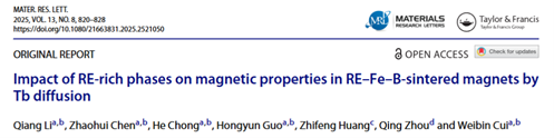 近日,太阳成集团tyc33455EPM实验室崔伟斌教授团队在稀土永磁材料研究领域取得重要进展。相关成果以Impact of RE-rich phases on magnetic properties in RE-Fe-B sintered magnets by Tb diffusion为题,在国际知名期刊Material research letters发表。太阳成集团tyc33455为该论文的第一完成单位,材料科学与工程学院博士研究生李强为第一作者,EPM实验室材料物理学科崔伟斌教授为本文通讯作者。我校分析测试中心为本研究提供有力支撑。