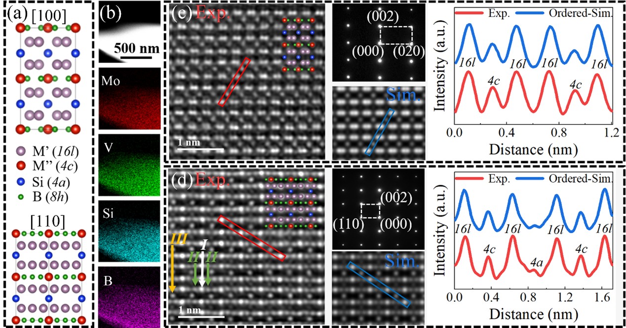本研究合成了两种新型四元层状面外有序占位硼化物(o-T2相):Mo₄VSiB₂与Nb₄VSiB₂。利用中子衍射及扫描透射电子显微镜等表征手段,首次在实验上确认了上述两种化合物中不同过渡金属原子在晶体结构中的“面外有序”占位,即原子半径较大的Mo或Nb优先占据特定晶格位置(16l位点),而原子半径较小的V占据另一位置(4c位点)。为进一步验证这一原子占位规律,通过调节Mo和V的化学计量比,成功合成出在16l位点形成固溶体的(V₀.₇₅Mo₀.₂₅)₄VSiB₂。系统的结构分析与计算模拟结果表明,该体系中V原子倾向于优先占据4c位点,从而在热力学上更有利于成相。基于第一性原理计算,进一步证实了Mo₄VSiB₂材料在动力学与热力学上的稳定性,并通过COHP分析探讨了其键合特点。较弱的各向异性键合特征表明将其剥离为二维材料仍具有一定挑战,这为后续相关材料的可控制备与性能优化提供了理论依据。