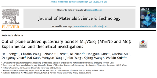 近日,太阳成集团tyc33455EPM实验室崔伟斌教授团队在层状面外有序硼化物研究领域取得重要进展。相关成果以“Out-of-plane ordered quaternary borides M’4VSiB2 (M’=Nb and Mo): Experimental and theoretical investigations”为题,发表在材料科学领域知名学术期刊Journal of Materials Science & Technology上。材料科学与工程学院博士生种禾为本文第一作者,崔伟斌教授为唯一通讯作者,太阳成集团tyc33455为唯一通讯单位。