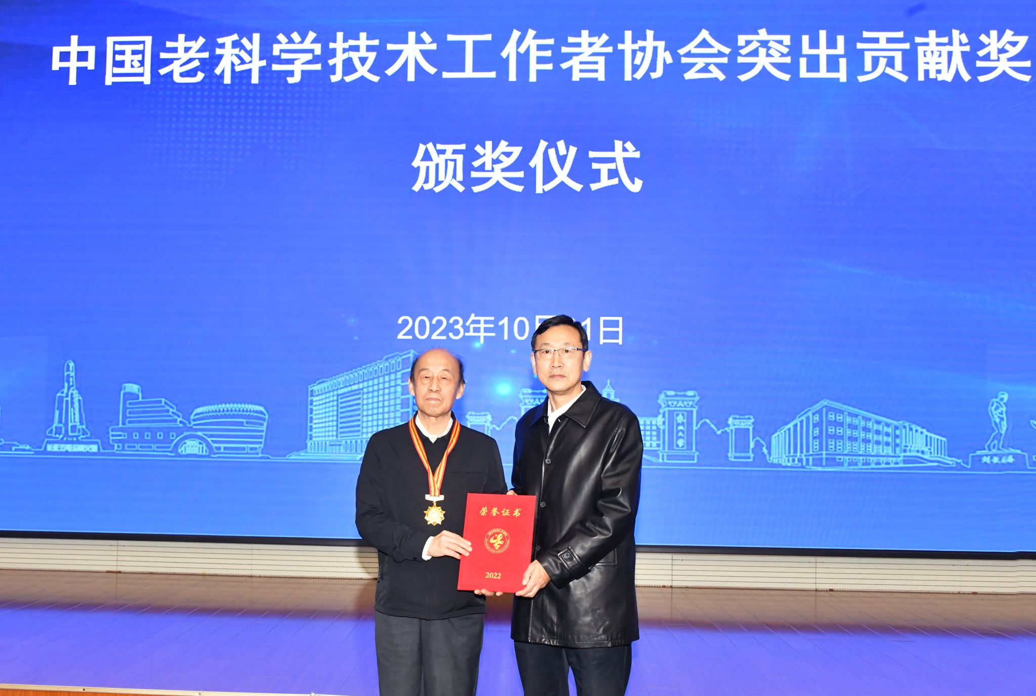辽宁省老科协副会长胡伟宣读表彰决定,张铁民为王国栋院士颁发奖状和奖牌。