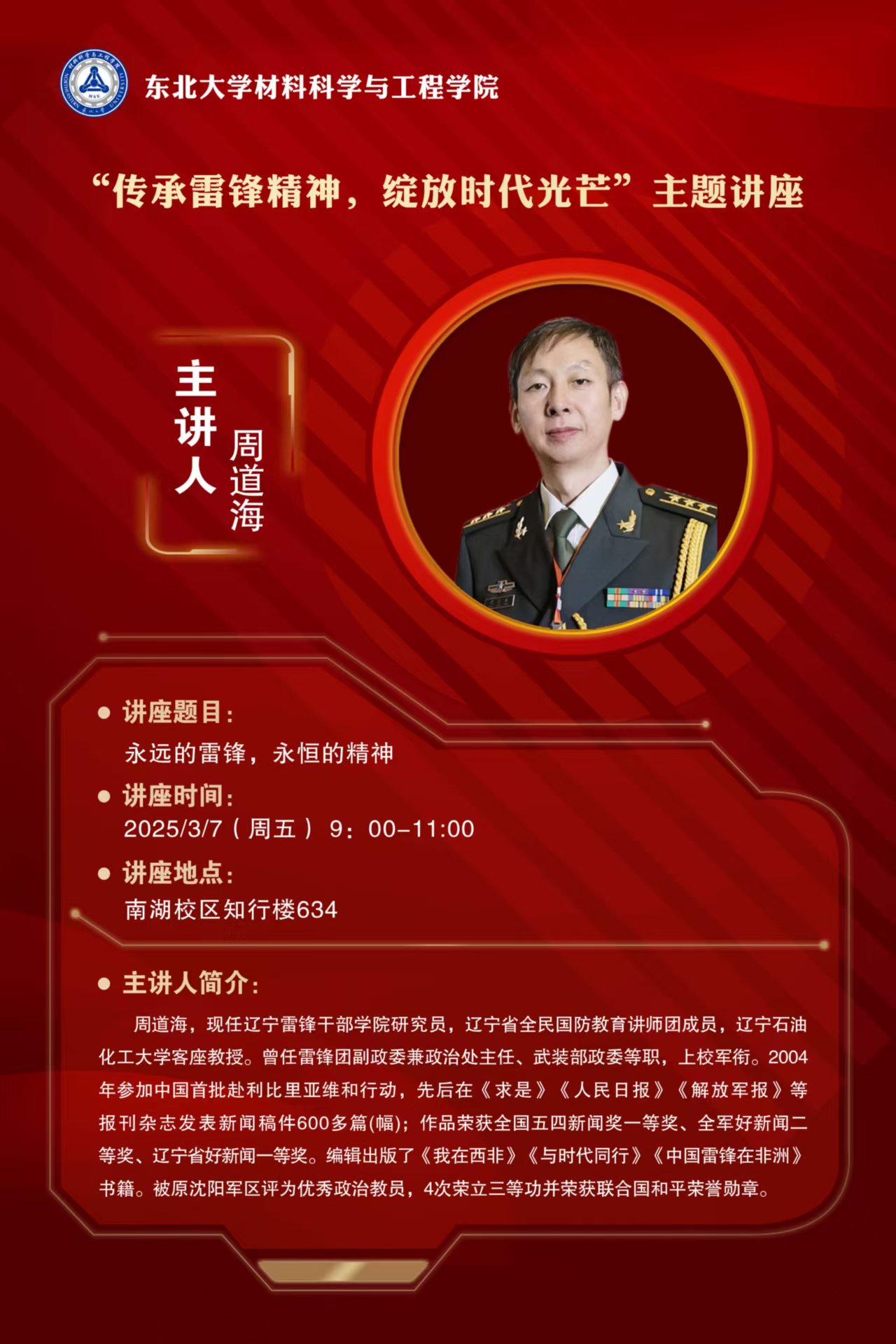主讲人简介:周道海,现任辽宁雷锋干部学院研究员,辽宁省全民国防教育讲师团成员,辽宁石油化工大学客座教授。曾任雷锋团副政委兼政治处主任、武装部政委等职,上校军衔。2004年参加中国首批赴利比里亚维和行动,先后在《求是》《人民日报》《解放军报》等报刊杂志发表新闻稿件600多篇(幅);作品荣获全国五四新闻奖一等奖、全军好新闻二等奖、辽宁省好新闻一等奖。编辑出版了《我在西非》《与时代同行》《中国雷锋在非洲》书籍。被原沈阳军区评为优秀政治教员,4次荣立三等功并荣获联合国和平荣誉勋章。