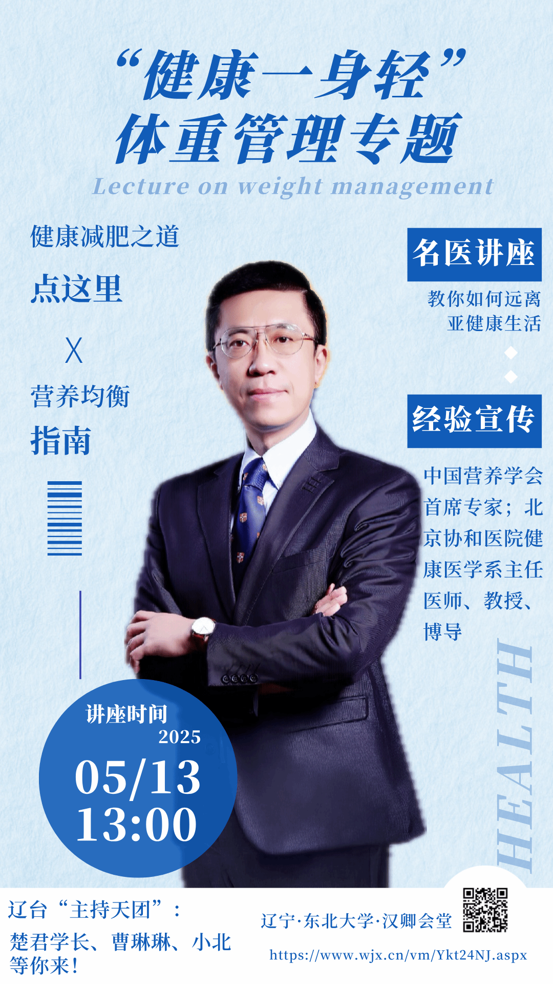 活动内容:邀请国家卫生健康委营养标准委员会委员,中国营养学会首席专家,北京协和医院临床营养科主任于康教授,为师生结合体重管理和健康管理进行科学指导,帮助师生改善饮食结构,守护身体健康。