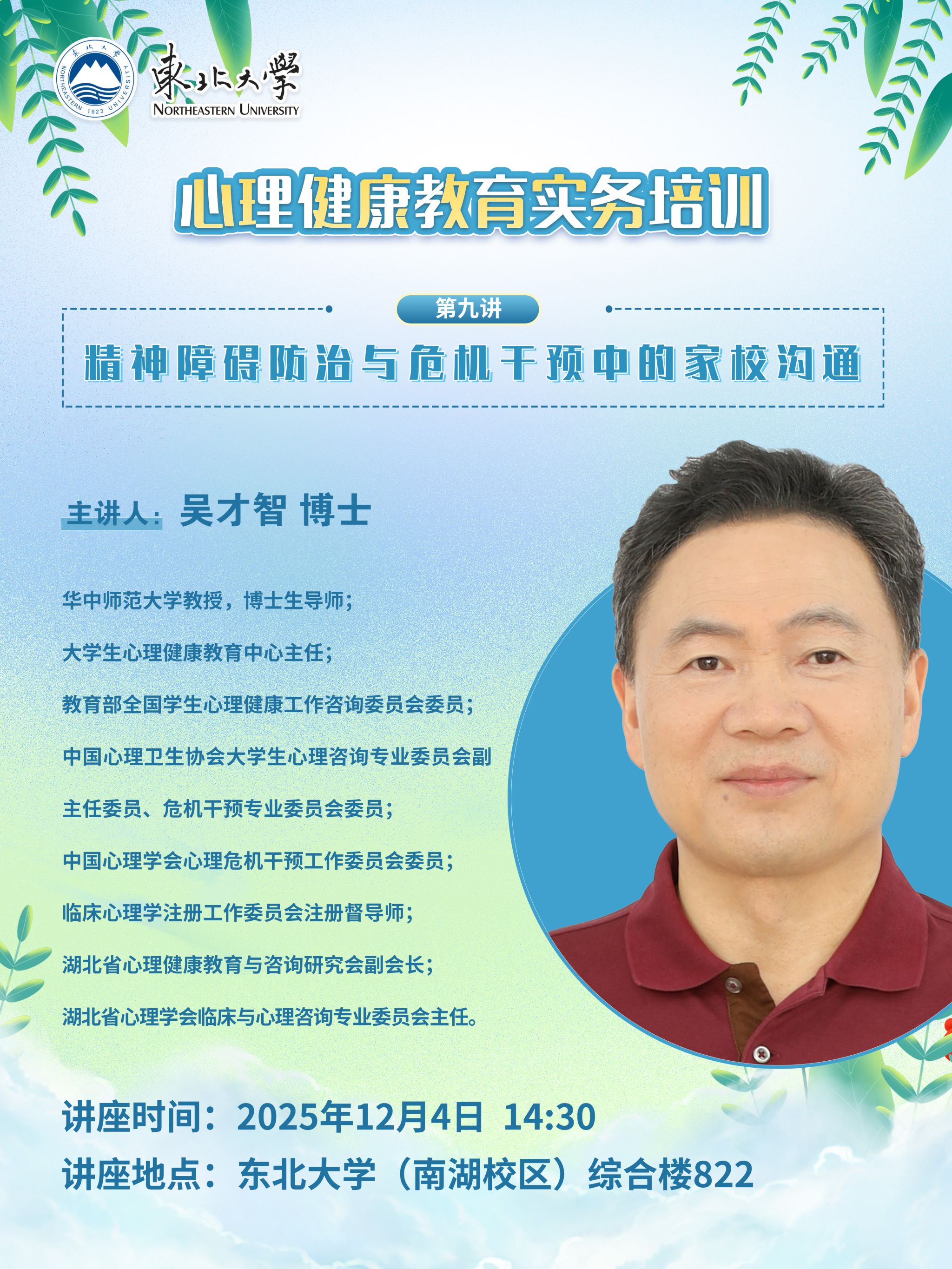 下一篇:【讲座预告】2025年心理健康教育专兼职咨询师胜任力培训——自杀风险的评估分级与管理