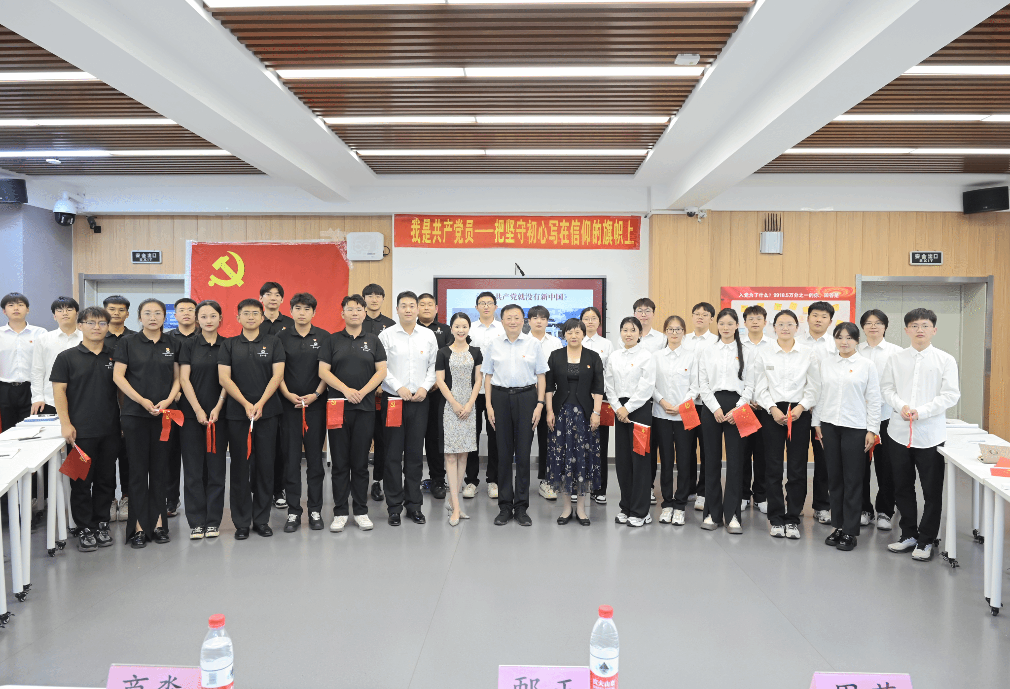 邴正为新党员史航旭同志佩戴党员徽章。新党员面向党旗进行宣誓,与会老党员重温入党誓词,全体师生高唱《没有共产党,就没有新中国》。