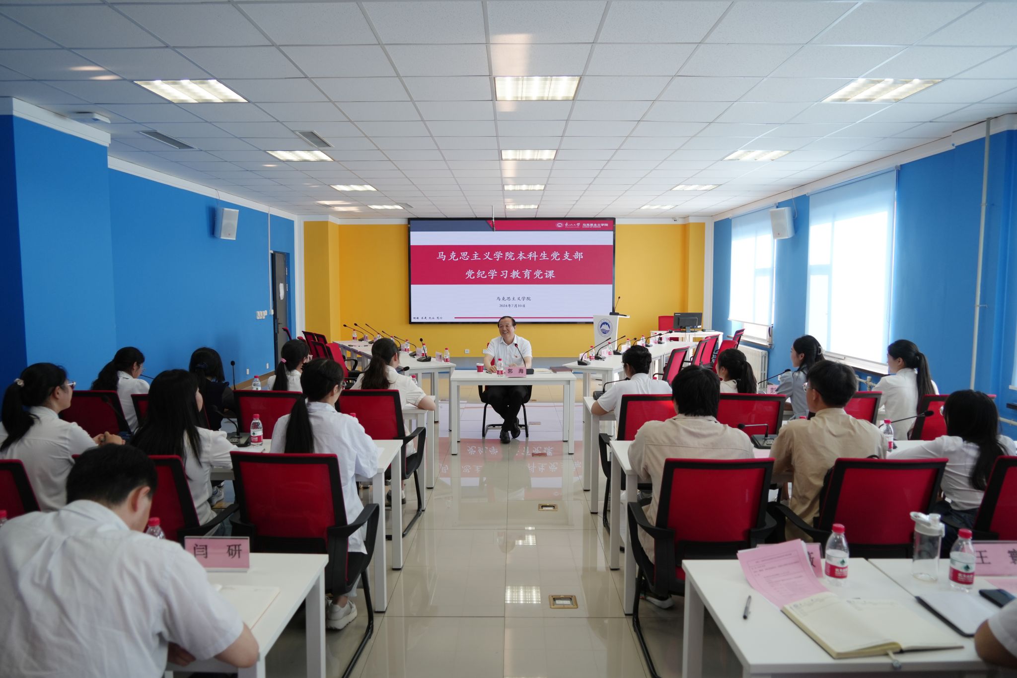 7月10日,校党委书记郭海在文管学馆A317室为马克思主义学院本科生党支部讲授党纪学习教育专题党课。党委办公室、党委宣传部、马克思主义学院相关负责人,马克思主义学院本科生党支部全体党员以及学院教师代表参加会议。